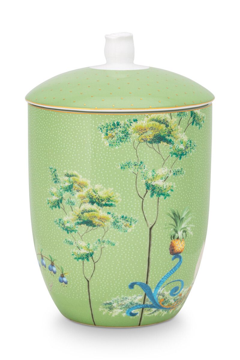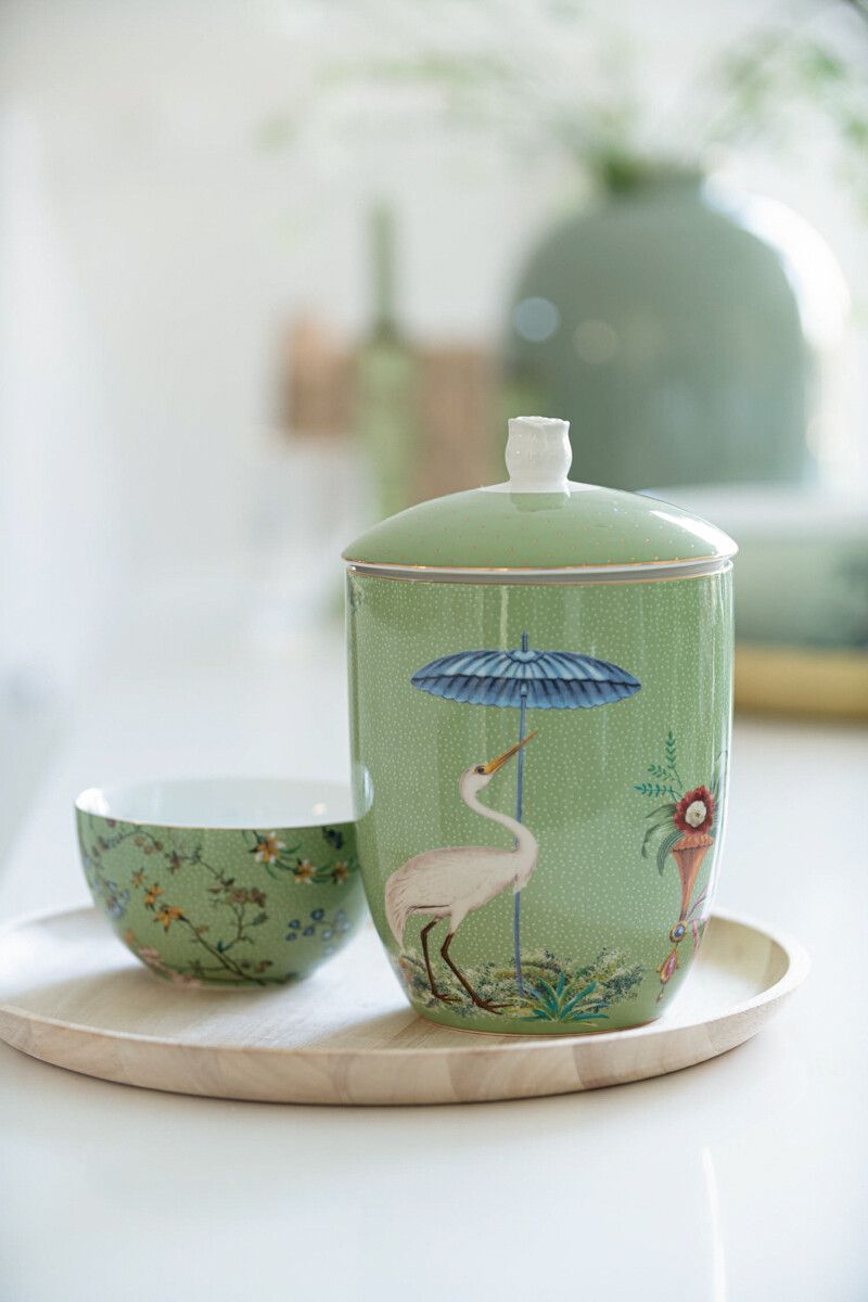 Deze prachtige voorraadpot geeft je een complete natuurlijke feer. Met een groene achtergrond en de tropische planten waan je je in een wereld vol natuur. Op de voorkant is een reiger afgebeeld onder een paraplu. Deze tropische vibe wordt gecombineerd met een groene deksel en kleurrijke bloemen. Combineer deze voorraadpot met andere items uit onze Jolie-collectie voor een verbluffend resultaat.